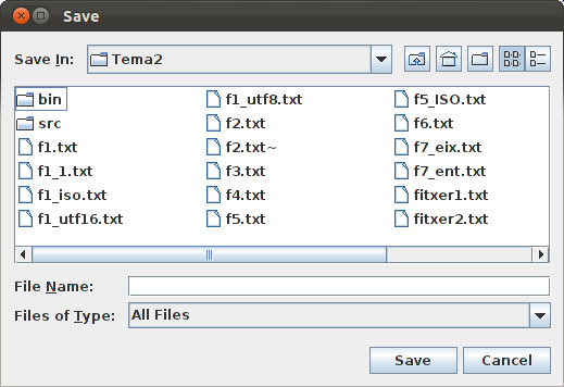 El component JFileChooser és capaç d'obrir un diàleg per a poder seleccionar un fitxer permetent navegar pel sistema de fitxers. Té dues variants: showOpenDialog i showSaveDialog, amb alguna diferència que ara comentarem.