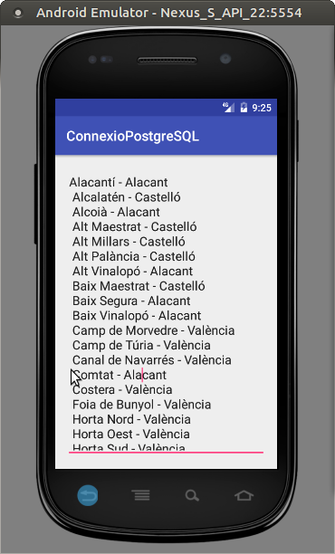 Tenim, però, una complicació. Des de la versió 3 d'Android no es permet una connexió a Internet des del programa principal, i per tant haurem de muntar un thread on es faça la connexió a PostgreSQL. Podríem estar temptats de fer-lo tot en el thread fill, però tenim una altra complicació, i és que només es poden canviar els controls del layout principal des del programa principal. És a dir, que el EditText només es pot canviar des del MainActivity (si no li hem canviat el nom, es dirà així).