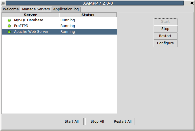 En la segona pestanya tenim la gestió dels servidors, amb els botons de posar en marxa, parar, ... En la imatge ja estan tots en marxa: