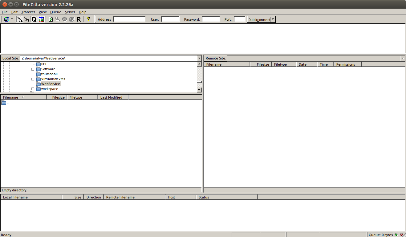 Si no és així podem utilitzar un client FTP per a poder pujar els fitxers. Un dels més compactes és Filezilla, que fins i tot té una versió portable. Aquesta és l'execució de Filezilla quan no tenim cap connexió. A l'esquerra tenim els directoris de la nostra màquina. I a la dreta apareixeran els fitxers i directoris del lloc web quan connectem.