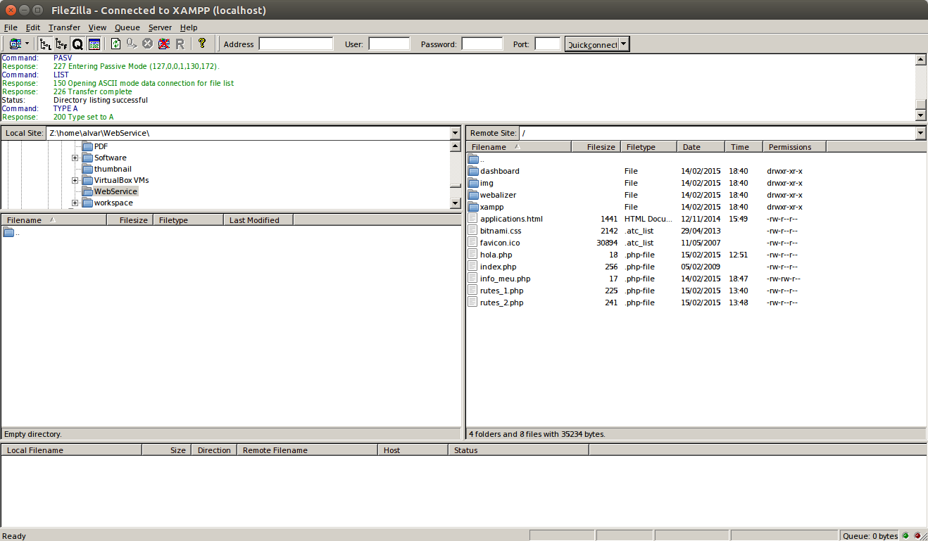 En aquesta imatge ja hem connectat, i es veu a la dreta l'estructura de fitxers i directoris del lloc web, que físicament estava en /opt/lampp/htdocs. Per a pujar els fitxers, només els hem d'arrastrar des de l'esquerra fins la dreta.