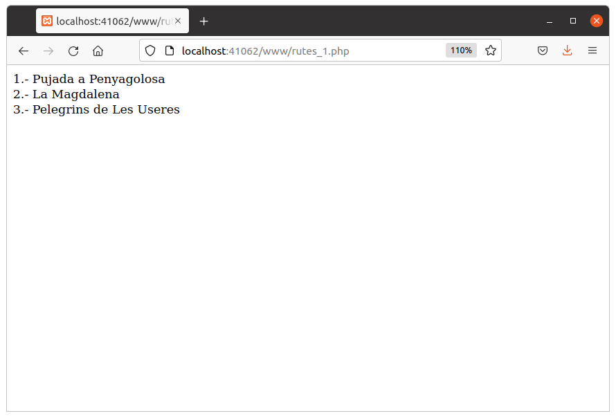 El resultat serà el següent (si utilitzem la imatge de docker, l'adreça és http://localhost:41062/www/rutes_1.php ; si hem instal·lat directament xampp serà http://localhost/rutes_1.php ):