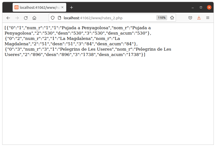 Guardeu el següent exemple amb el nom rutes_2.php, accediu des d'un navegador, i obtindreu les dades en JSON.