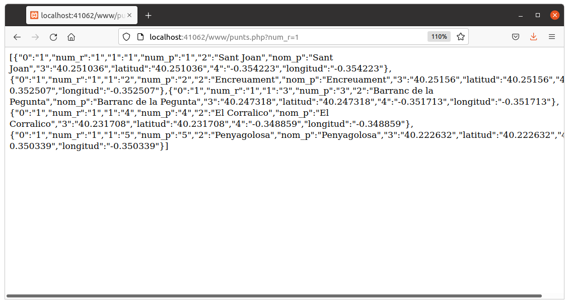 Ens podem plantejar també accedir a aquest Web Service per a traure els punts d'una determinada ruta, també amb format JSON. El guardarem com a punts.php