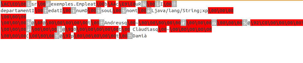 El fitxer creat, Empleats.obj, evidentment no és de text. Tanmateix si l'obrim amb un editor de text podrem veure alguna cosa.
