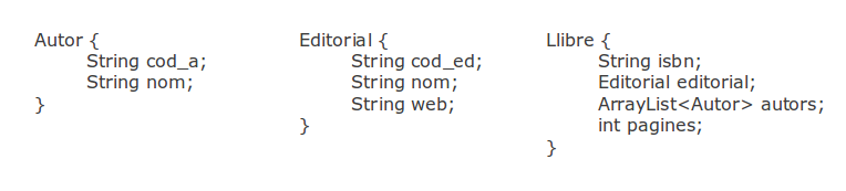- Més complicada és la manera d'indicar els autors del llibre. Com pot haver més d'un autor per llibre, en objectes posem un ArrayList de tipus Autor, mentre que en el Model Relacional hem de posar una nova taula. Guardar les dades d'un llibre suposarà en la pràctica guardar en dues taules, LLIBRE i AUTOR_LLIBRE. Les dades de LLIBRE es poden guardar directament, i les de AUTOR_LLIBRE suposarà un bucle per a recórrer l'ArrayList i fer una operació d'escriptura (INSERT) en AUTOR_LLIBRE per cada autor de la llista. A l'inrevès també haurem de fer un bucle, recorrent totes les files dels autors del llibre en qüestió, per a anar inserint en l'ArrayList.