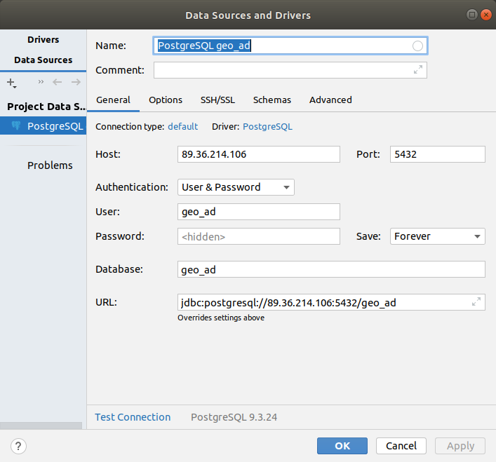 I aquestes són les dades de connexió a la Base de Dades geo_ad de PostgreSQL: