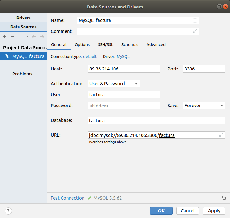 Si la connexió fóra a MySQL la BD factura, recordem que les dades de connexió serien: