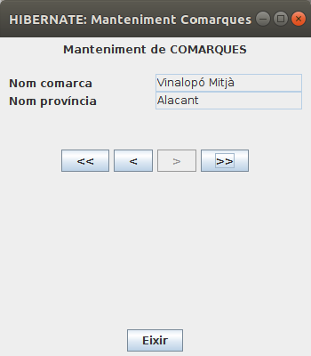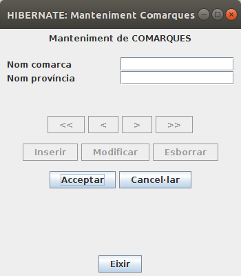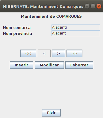 Modifica l'anterior per a posar també botons per a Inserir noves comarques, esborrar o modificar. En un primer moment aquestos botons prepararan l'acció, però no la realitzaran.