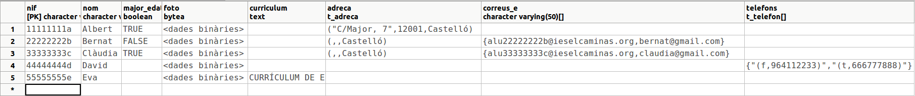 Si mirem el contingut de la taula des del PgAdmin III, podrem veure el contingut del camp de tipus TEXT, però no el de tipus BYTEA