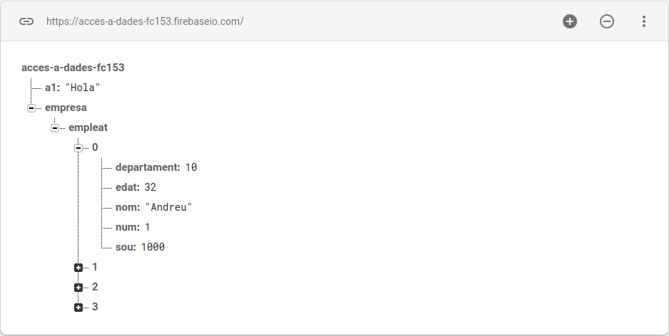 Ja heu vist que en importar Empleats.json s'han perdut les altres dades. Poseu una altra vegada la parella clau-valor a1 (per exemple amb el valor Hola) ja que per ser molt senzilla l'estructura la utilitzarem en alguns exemples. Així ens queda l'estructura per als posteriors exemples: