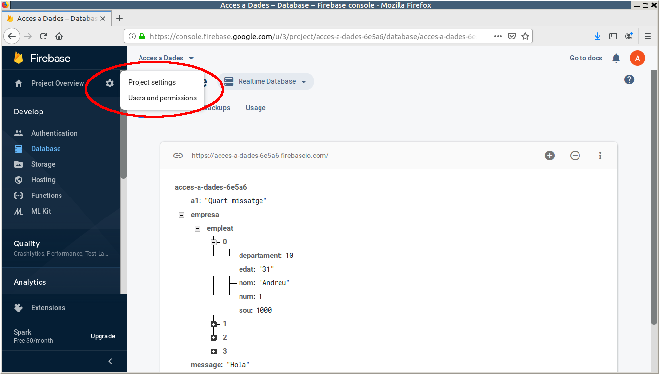 No us oblideu de substituir el nom del fitxer json. També heu de tenir en compte que la URL de la base de dades serà diferent per a cadascú de nosaltres.