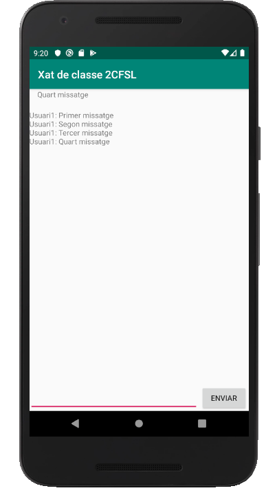 - El TextView central que ocupa quasi tota la pantalla, anomenat area, que el modificarem amb la modificació de la llista addChildEventListener()