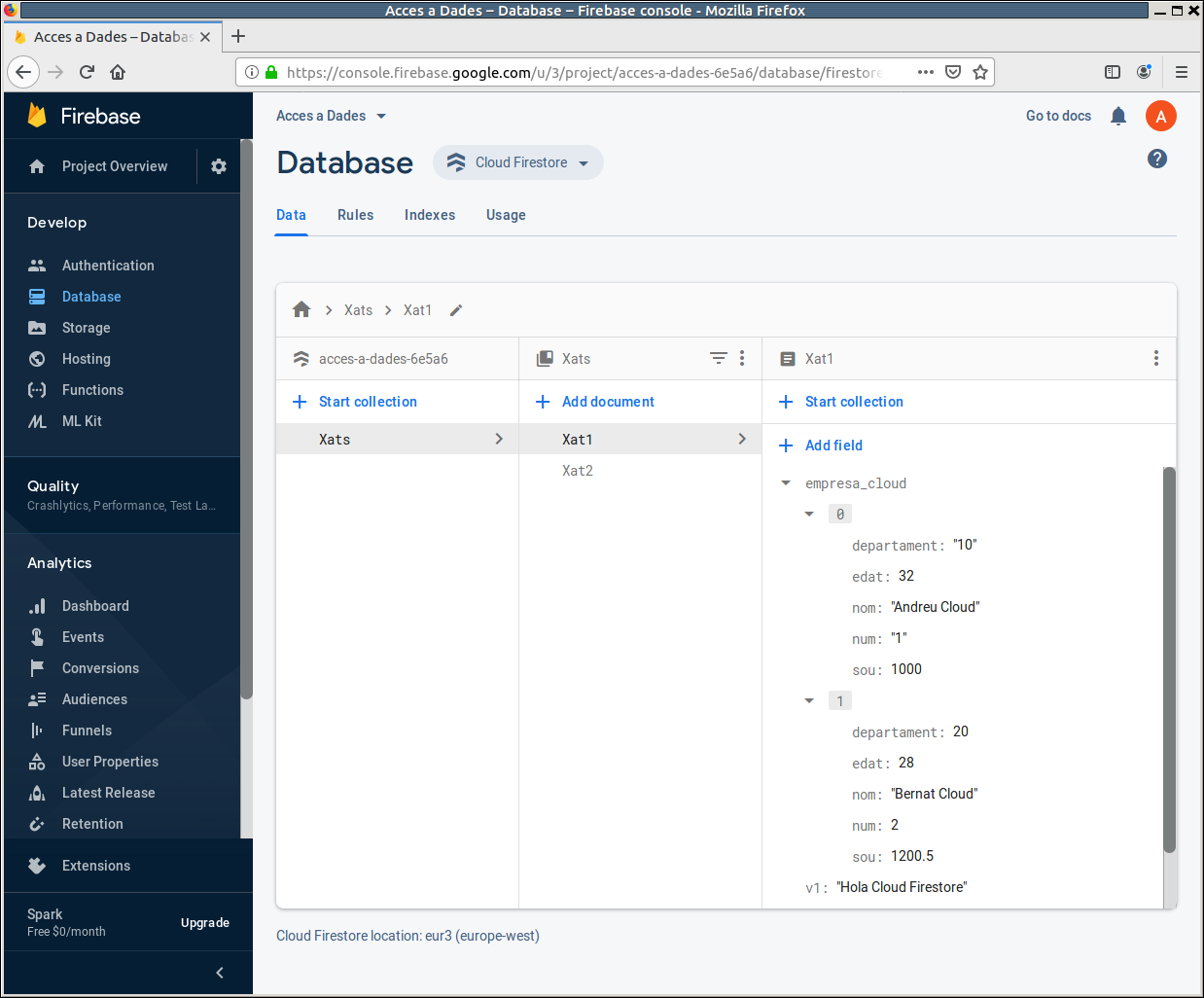 Per tant, després de l'anterior tenim una col·lecció anomenada Xats, dins de la qual hi ha un document anomenat XatProva, dins del qual hi ha un camp anomenat nomXat i una col·lecció anomenada missatges, dins del qual hi ha dos documents, un d'ells amb nom 0 i un altre amb nom generat per Cloud Firestore