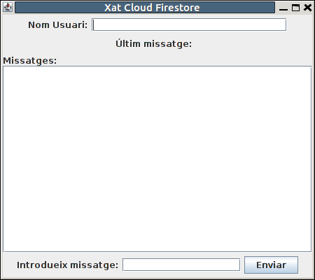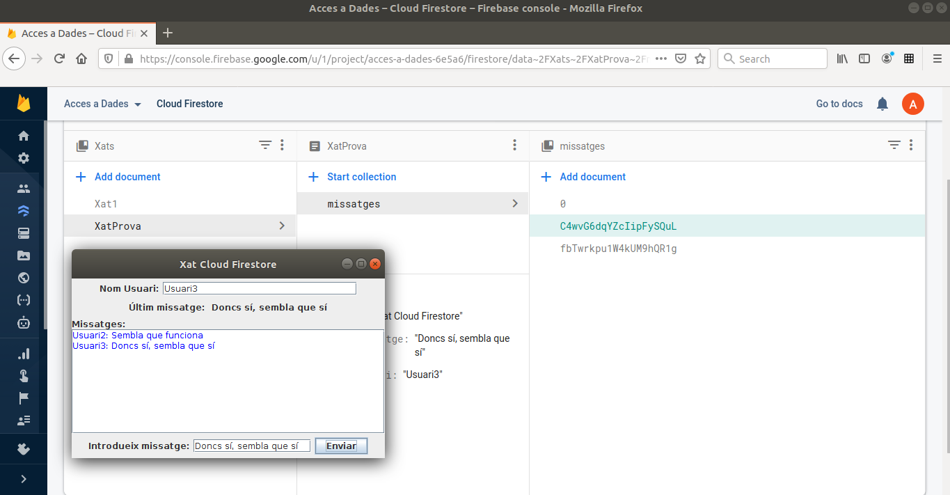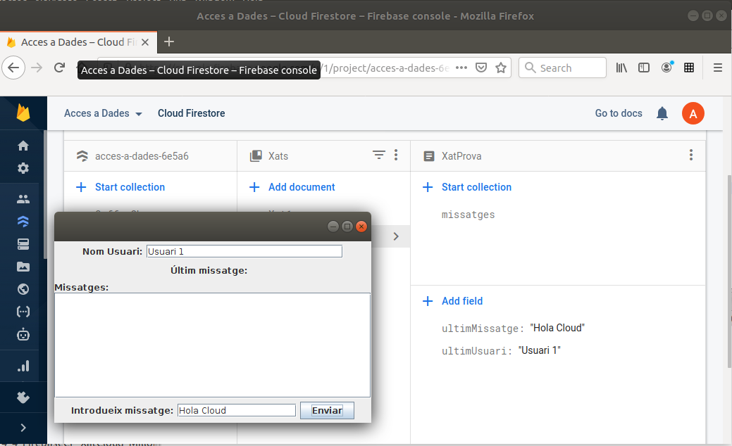 En el següent exemple. quan s'apreta el botó d'enviar (baix a la dreta) es guardarà el contingut del quadre de text usuari que està dalt i el de missatge que està baix. Però observeu que estem utilitzant el mètode set() i per tant matxacaríem el que ja teníem construït (el nom del xat i potser també la subcol·lecció de missatges). Per tant US ACONSELLE QUE NO EXECUTEU EL QUE VE A CONTINUACIÓ