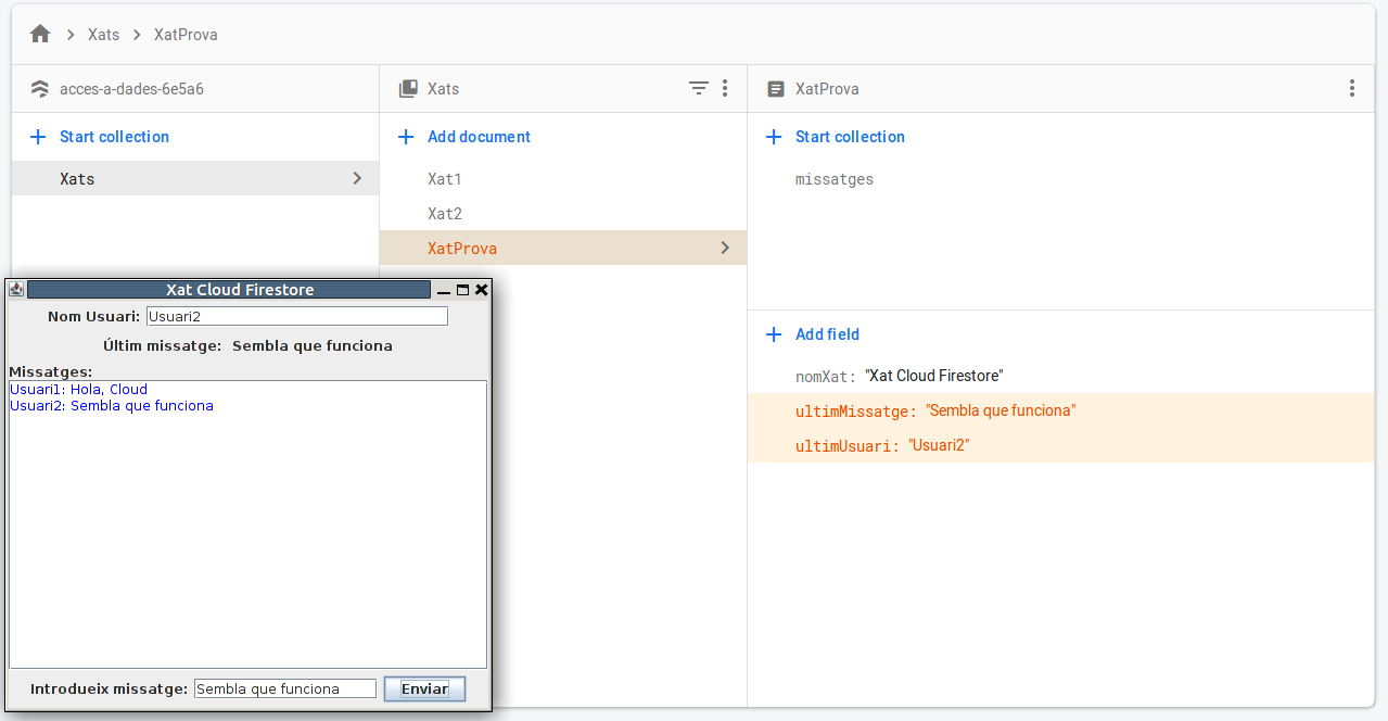 // Exemple de guardar dades en Cloud Firestore // Per a guardar dades. Sobre /Xats/XatProva i després sobre /Xats/Xat1 fun enviar() { val database = FirestoreClient.getFirestore() val docXatProva = database.collection("Xats").document("XatProva") val dades = HashMap<String, Any>() dades.put("ultimUsuari", usuari.getText()) dades.put("ultimMissatge", missatge.getText()) docXatProva.update(dades) }