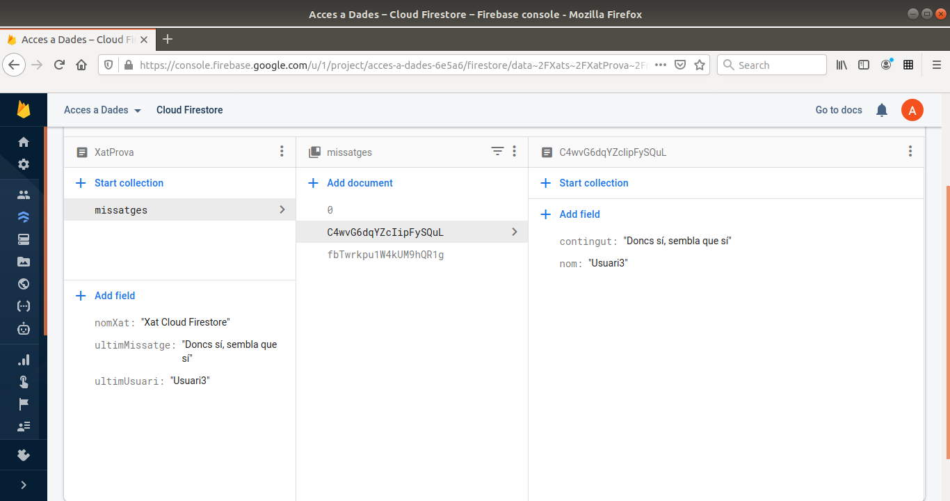 Ja havíem comentat en la pregunta 4.1 que per l'estructura de les dades a la qual ens convida Cloud Firestore, en compte de guardar els missatges (i l'usuari) en una llista, ho faríem en documents dins d'una subcol·lecció.