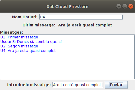 L'estructura de les dades la podem fer amb un Map<String,Object>, i posar-li en el nostre cas l'usuari i el missatge. D'aquesta manera ens quedaria ara el procediment en apretar el botó d'enviar el missatge, on a banda del que teníem abans per a modificar ultimMissatge i ultimUsuari, ara afegirem el document nou.