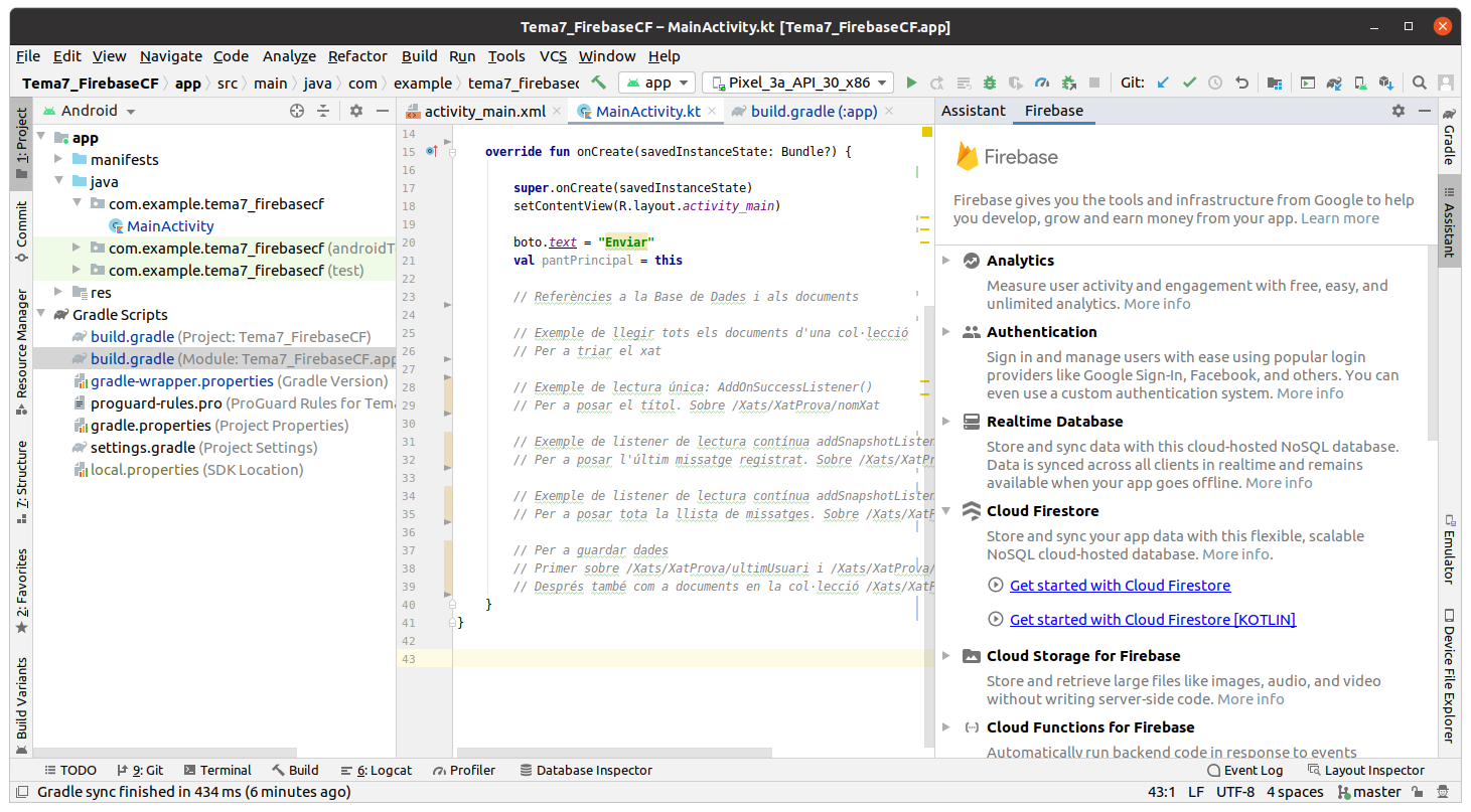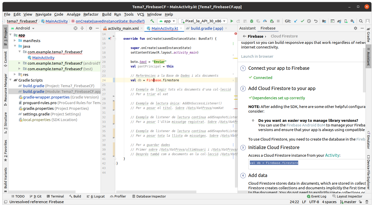 Anem a veure els passos per a poder connectar des de la nostra aplicació d'Android, i els explicarem un a un. Són els que ens marca l'assistent, que haurem d'invocar sobre el nostre projecte ja creat, i que es crida des de Tools --> Firebase --> Cloud Firestore. En l'última versió d'Android Studio ens permet trir el codi d'exemple directament en KOTLIN, i així ens estalviem la traducció de Java a Kotlin
