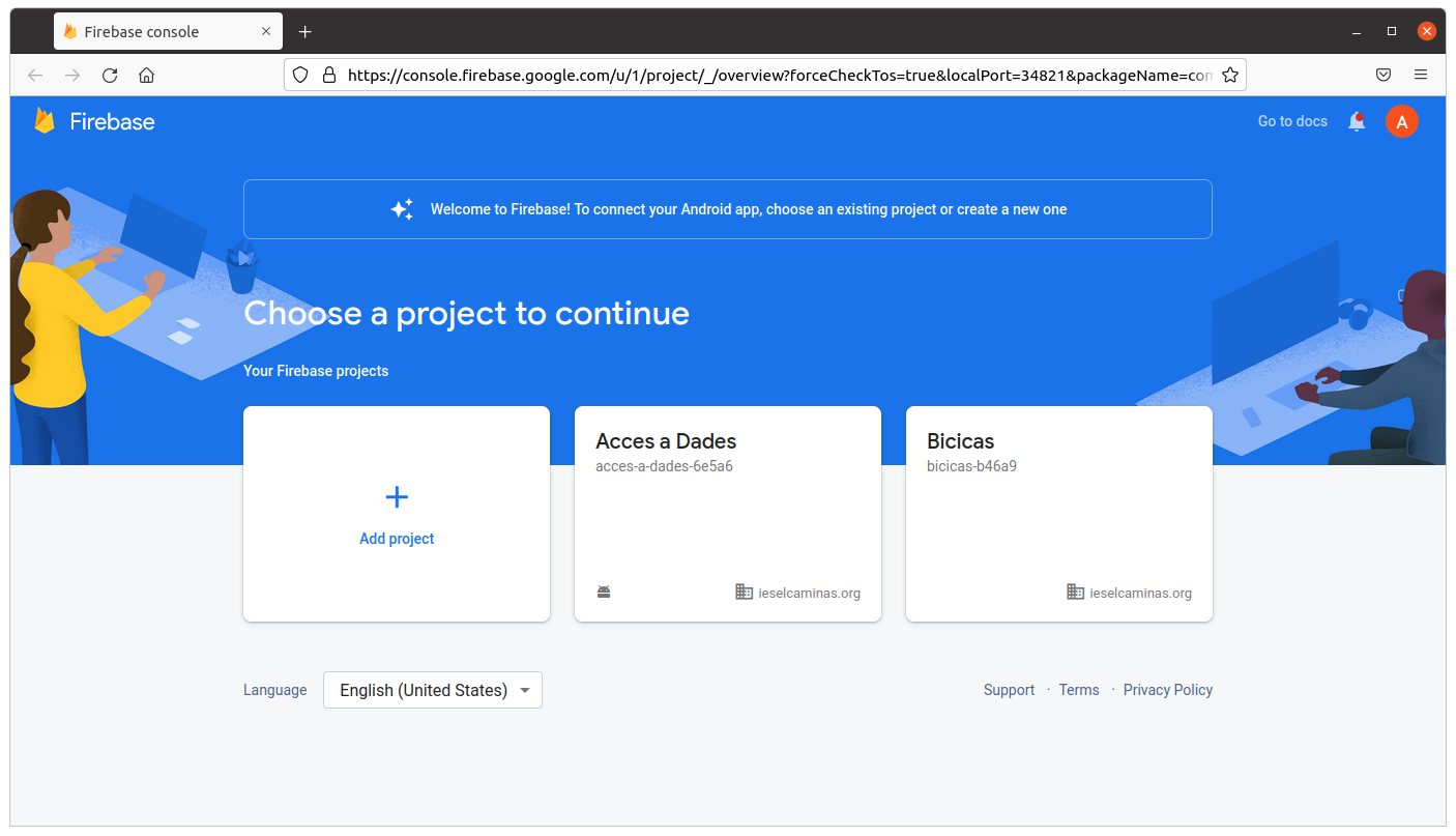 Una vegada autenticats en Firebase, des de l'entorn d'Android Studio ens ofereix la possibilitat de crear una aplicació nova (una Base de Dades nova) o utilitzar alguna de les que ja tenim. Utilitzarem la que ens ha servit de prova fins el moment: