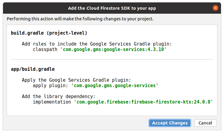 En aquest segon pas, quan apretem el botó Add the Cloud Firestore SDK to your app, ens dirà els canvis que farà per a incorporar les coses necessàries per a poder connectar.