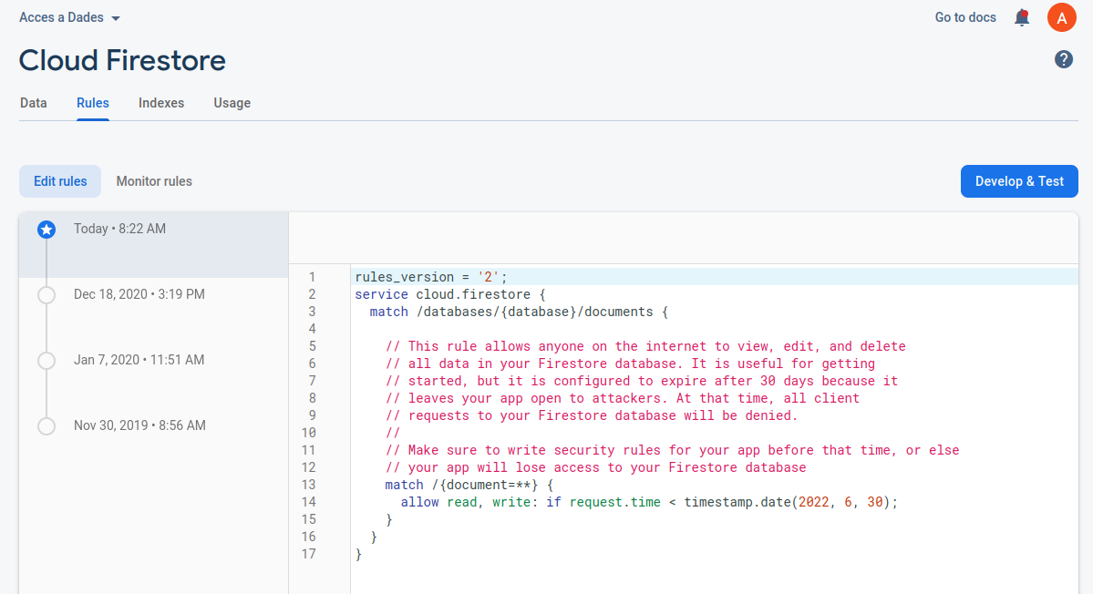 Com que Runtime Database i Cloud Firestore, encara que sembla que estan compartint la Base de Dades, en realitat no es pot accedir d'una a l'altra, igual ens passarà amb les regles d'accés (Rules). Segurament ho tindrem bé, perquè ja ho havíem controlat en la part d'IntelliJ, però encara així és convenient pegar-li una miradeta. Recordeu que és des de la consola de Firebase, entrant al Cloud Firestore, i anant a la pestanya Rules