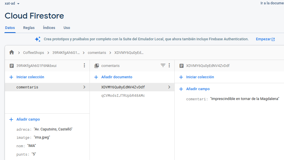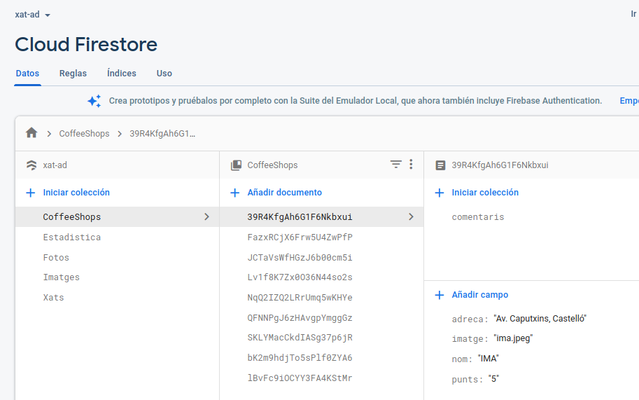 Dins del document del cafè tenim nom, adreca, punts i també el nom de la imatge guardada Cloud Storage. També tenim una col·lecció dins del document anomenada comentaris, i en cada document d'aquesta col·lecció de moment només tenim una parella clau-valor: comentari