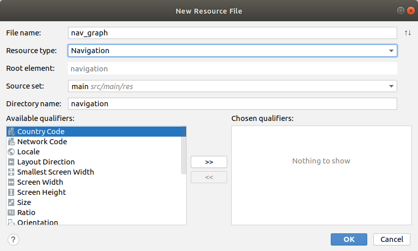 I és en el nav_graph.xml on es dissenya la manera de navegar. S'ha de crear sobre res -> New -> Android Resource File, amb el nom especificat (no cal posar .xml) i cuidant que siga en recurs de tipus Navigation