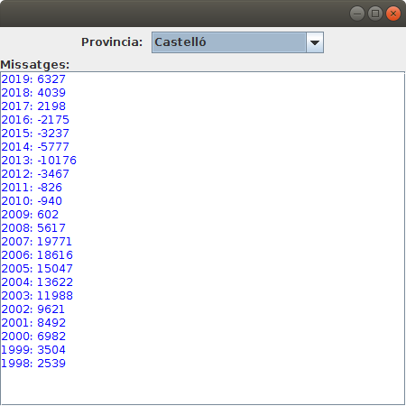 L'aplicació ha de agafar les províncies (observeu que estan en una llista) i guardar-les en un JComboBox, per a poder triar-les. Quan es trie una província, s'haurà de mostrar en el JTextArea la informació corresponent a la província, agafant tots els anys de l'array Data (observeu que també és una llista) i mostrar l'any i el valor de la variació poblacional (respectivament NombrePeriodo i Valor). No cal agafar tota la EstadisticaVariacioPoblacional. Podeu anar directament a un element de l'array. Per exemple EstadisticaVariacioPoblacional/0/Data fa referència a les dades de la primera província