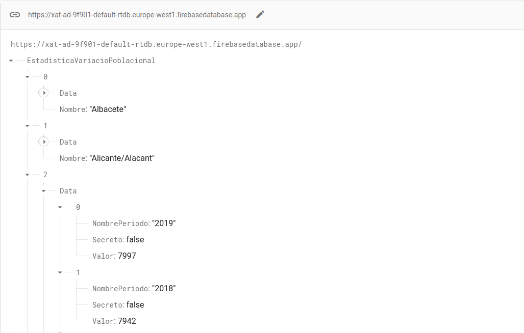 La informació a la qual volem accedir està en el array EstadisticaVariacioPoblacional amb les províncies, i en cada província tenim el nom (Nombre) i en un array anomenat Data tenim diferents anys amb el número d'any i el valor de la variació de la població: