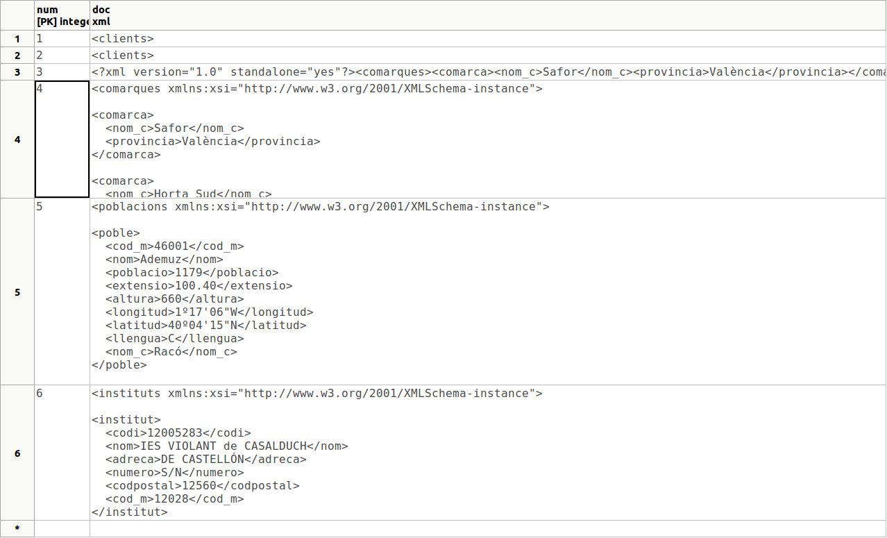 En la següent imatge es mostra el contingut de la taula P_XML, on s'han ampliat les noves files per poder veure el contingut: