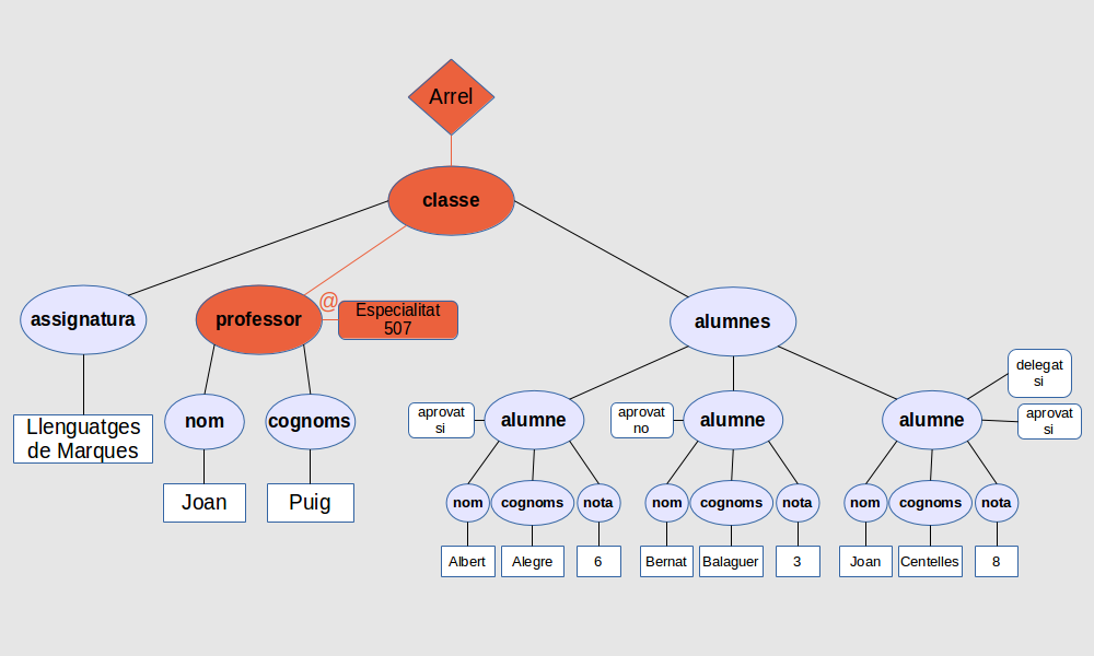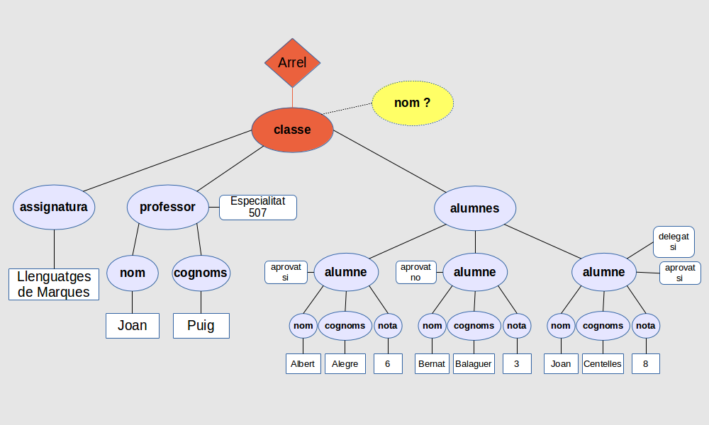Com que en arribar al node classe no n’hi trobarà cap d’anomenat <nom>, no retornarà cap resultat, com podeu veure si seguiu l’arbre: