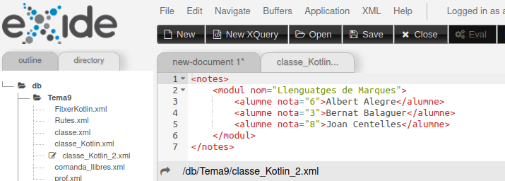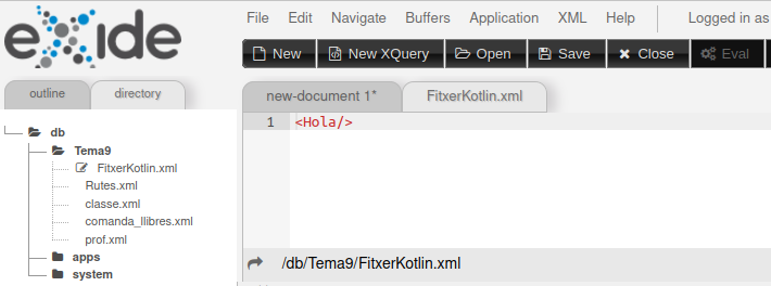 Observeu, com en aquest exemple hem escapat les cometes dobles, per a que arriben a eXist-db. Si refresquem el directori en eXide, veurem que ja apareix el document nou, i podrem veure el seu contingut