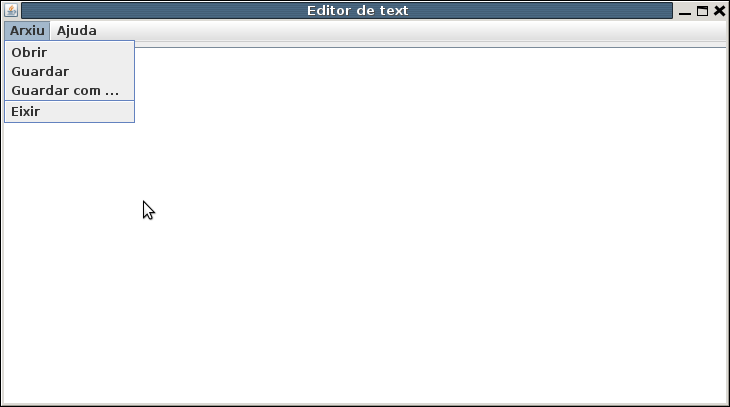 Ara serà únicament un JTextArea, i les opcions les tindrem en menú. Utilitzeu el component JFileChooser per a buscar fitxers i per a guardar-los que ens proporciona Swing. Ja teniu implementada l'opció d'eixir.