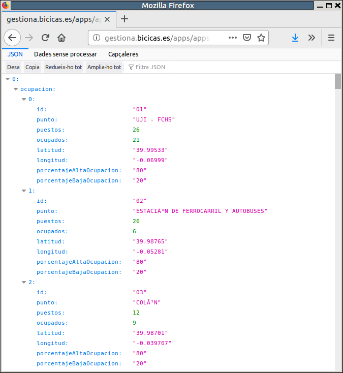 Anem a veure un parell de casos més reals. Aquesta és la contestació que fa el WebService de Bicicas en sol·licitar l'estat actual de bicicletes en els diferents punts (en el moment de fer els apunts es consulta en l'adreça http://gestiona.bicicas.es/apps/apps.php):