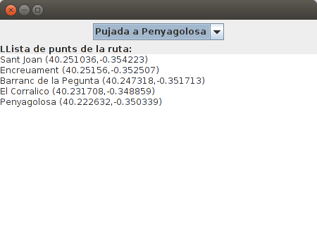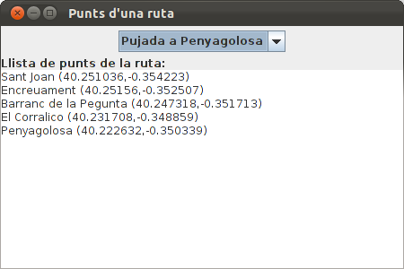 Fer una aplicació gràfica que llegirà el fitxer Rutes.xml per a que apareguen els noms de les rutes en un JComboBox. Quan se seleccione una, ha d'aparèixer la llista de punts (nom, latitud i longitud) en un JTextArea. L'aspecte podria ser el següent: