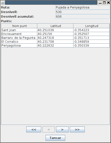 - RUTES: que contindrà tota la informació del conjunt de la ruta. La clau principal s'anomenarà num_r (entera). També guardarà el nom de la ruta (nom_r), desnivell (desn) i desnivell acumulat (desn_ac). Els tipus d'aquestos tres camps últims seran de text, enter i enter respectivament.