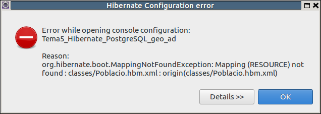 En la instal·lació d'Hibernate sobre Eclipse 2019-06 dóna un error en la perspectiva d'Hibernate immediatament després de generar les classes, marcant com que no troba els fitxers de mapatge