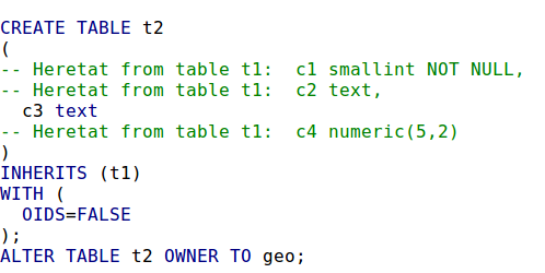 La taula t2 tindrà, a banda de l'atribut definit, en tindrà 2 més, c1 i c2, heretats de t1.