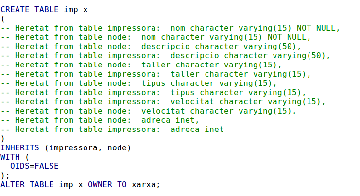 En el moment de crear la taula ens ha avisat que s'heretaven columnes amb el mateix nom, però no ha hagut cap problema. Només els col·loca una vegada, encara que en comprovar en l'estructura que ens mostra PgAdmin sembla que les columnes estiguen més d'una vegada: