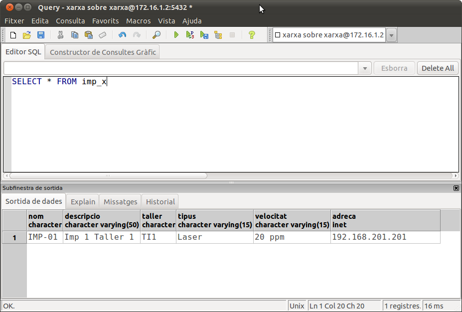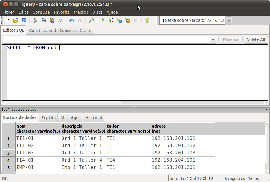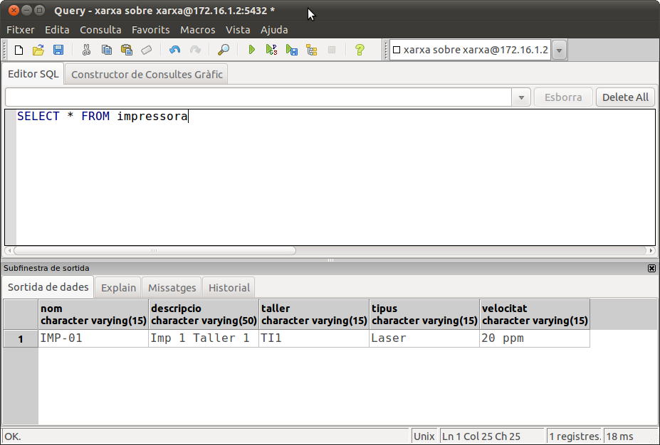 Podem comprovar que si llistem la taula IMPRESSORA, apareixerà, i si llistem la taula NODE, també eixirà acompanyada de tots els equips.