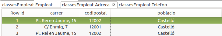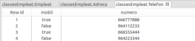 Com que no hem esborrat en cascada, si després mirem des de la perspectiva OME, comprovarem que encara existeixen els objectes adreça i telèfon, i que ara no correspondran a cap empleat. Hauríem d'aprofitar el moment per a esborrar des de la perspectiva OME les instàncies de Adreca i Telefon que corresponien a l'empleat que hem esborrat, per deixar-lo consistent. En les següents imatges es mostra aquest fet: