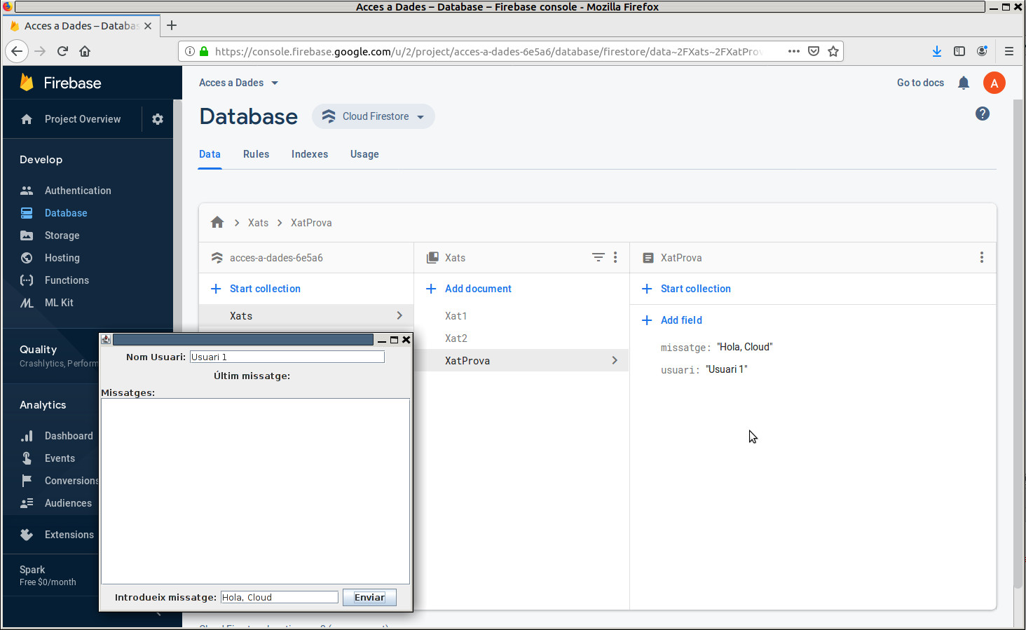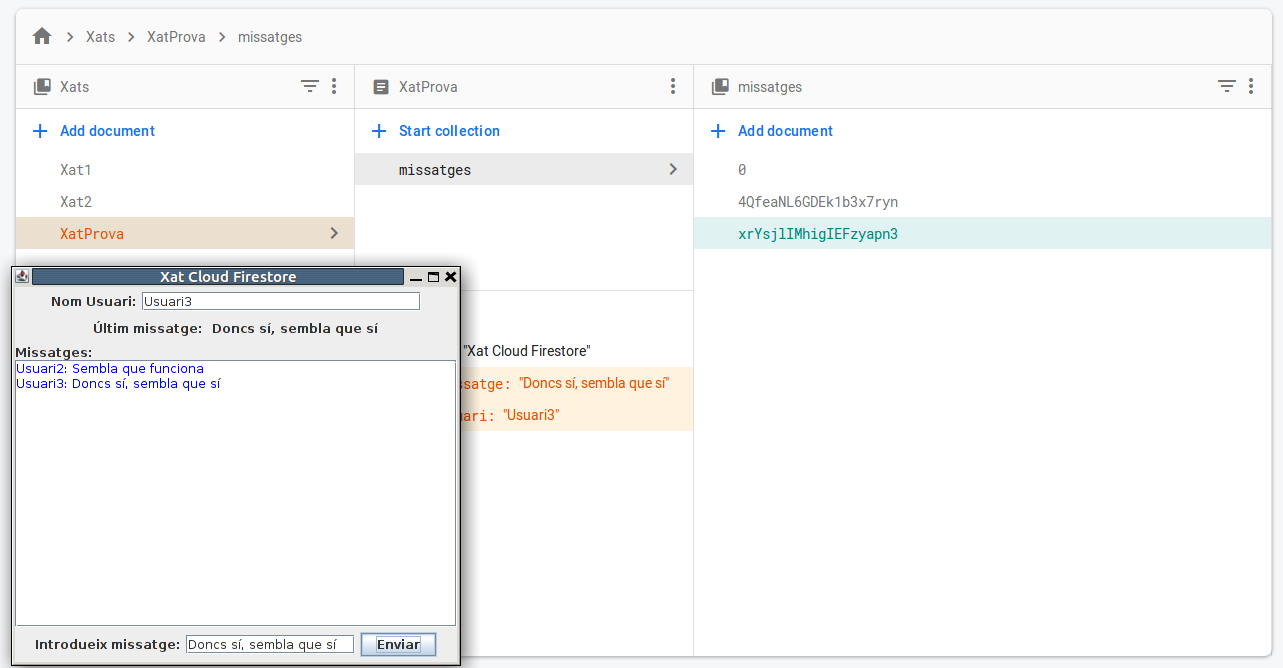 En el següent exemple. quan s'apreta el botó d'enviar (baix a la dreta) es guardarà el contingut del quadre de text usuari que està dalt i el de missatge que està baix. Però observeu que estem utilitzant el mètode set() i per tant matxacaríem el que ja teníem contruït (el nom del xat i la subcol·lecció de missatges). Per tant US ACONSELLE QUE NO EXECUTEU EL QUE VE A CONTINUACIÓ