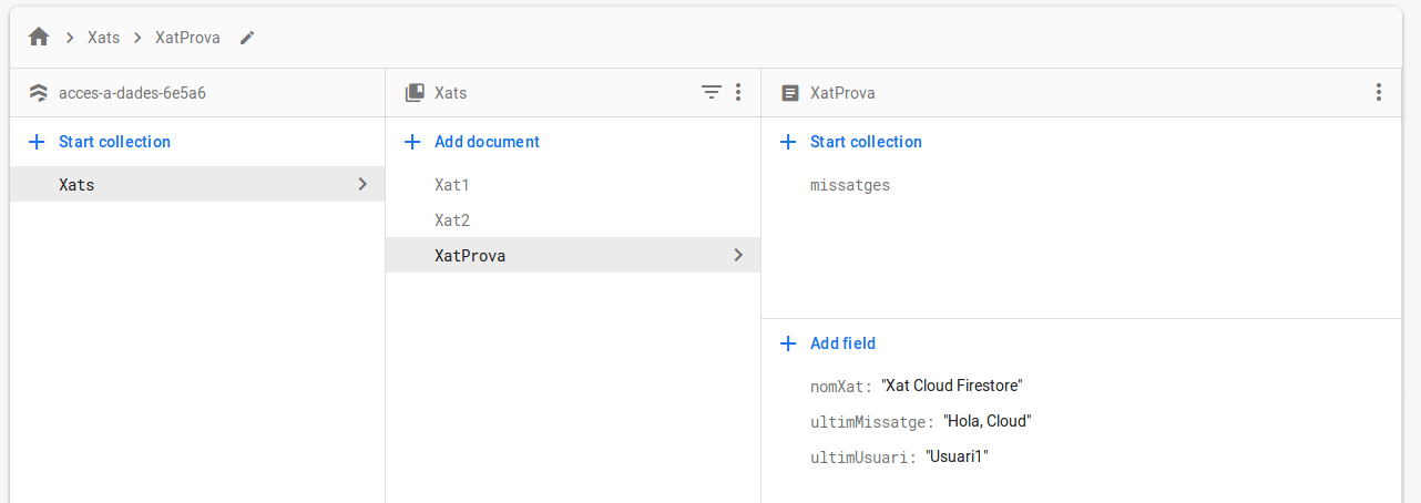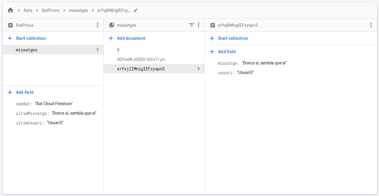Ja havíem comentat en la pregunta 2.3.1 que per l'estructura de les dades a la qual ens convida Cloud Firestore, en compte de guardar els missatges (i l'usuari) en una llista, ho faríem en documents dins d'una subcol·lecció.