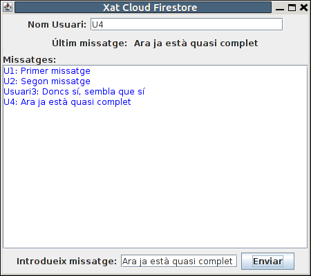 L'estructura de les dades la podem fer amb un Map<String,Object>, i posar-li en el nostre cas l'usuari i el missatge. D'aquesta manera ens quedaria ara el procediment en apretar el botó d'enviar el missatge, on a banda del que teníem abans per a modificar ultimMissatge i ultimUsuari, ara afegirem el document nou.