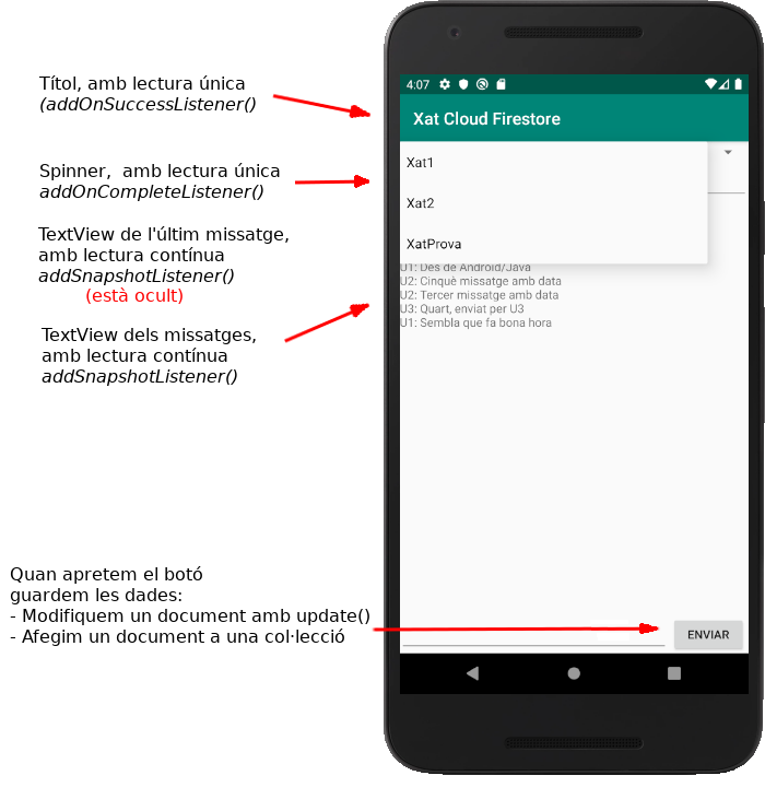 De moment ens aconformarem amb fer una lectura única de tots els documents del xat per a mostrar-los en un Spinner. Posteriorment, en l'exemple complet de la següent pregunta intentarem triar un xat o un altre per a que ens mostre els missatge de l'un o de l'altre.