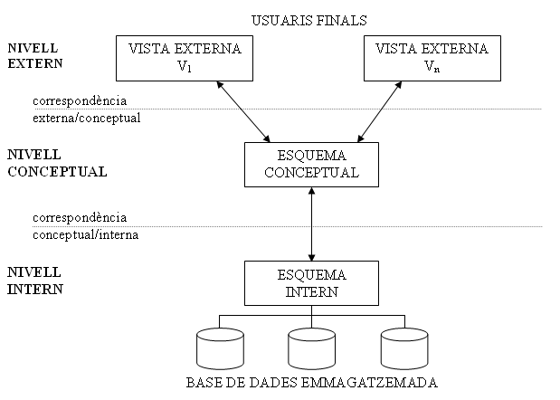 - Al NIVELL CONCEPTUAL o LÒGIC hi ha un esquema conceptual, que descriu l'estructura de tota la B.D. per al conjunt dels usuaris. Oculta els detalls de les estructures físiques d'emmagatzematge. S'utilitza un model de dades conceptual o d'implementació