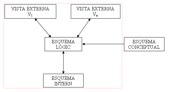 - Al NIVELL EXTERN o DE VISTES s'inclouen diversos esquemes externs o vistes d'usuari. Cada esquema extern descriu la part de la B.D. que interessa a un grup d'usuaris determinat, i oculta la resta de la B.D. S'utilitza també un model conceptual o d'implementació.