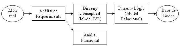 En realitat, en sistemes grans, no podem separar l'anàlisi de les dades de l'anàlisi dels processos a fer amb les dades. Aleshores, paral·lel al disseny conceptual, és a dir, després de l'anàlisi de requeriments aniria l'Anàlisi Funcional (línia discontínua), encarregat de veure quins processos generals són necessaris en el sistema. Nosaltres no filarem tan prim.