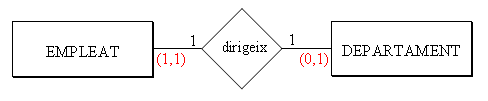 Un empleat pot dirigir 0 o 1 departament, i un departament és dirigit (com a mínim i com a màxim) per 1 empleat. Ho posarem entre parèntesis (card. mínima, card. màxima) al costat de l’entitat[1]. En realitat el nou concepte és la cardinalitat mínima, ja que la màxima és la cardinalitat d'abans. Els valors habituals de cardinalitat mínima són 0 i 1.